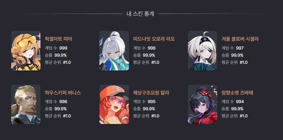 내 스킨 통계에서는 게임 수, 승률, 평균 순위의 간략한 스킨별 통계를 제공합니다.