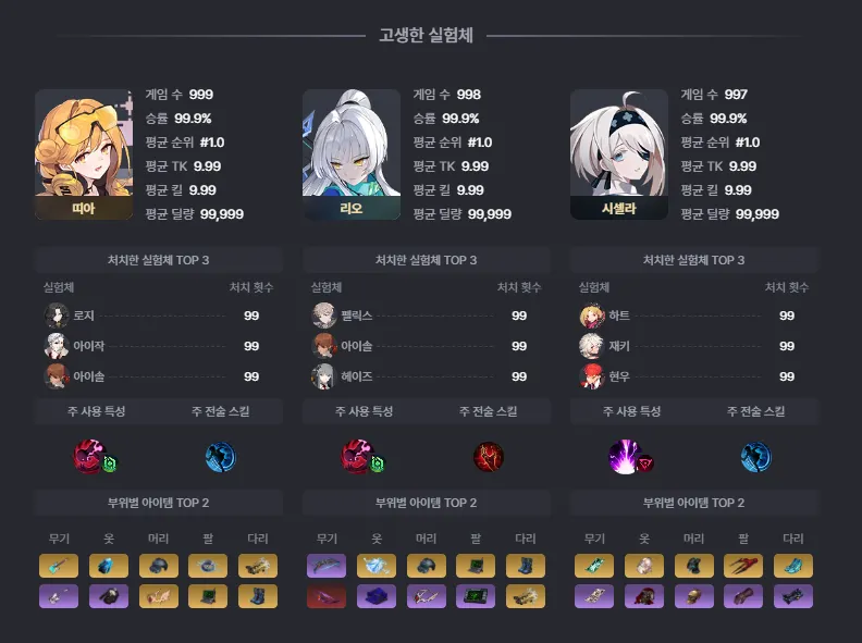 고생한 실험체에서는 내가 가장 많이 플레이한 TOP6 실험체의 다양한 세부 내용을 제공합니다.