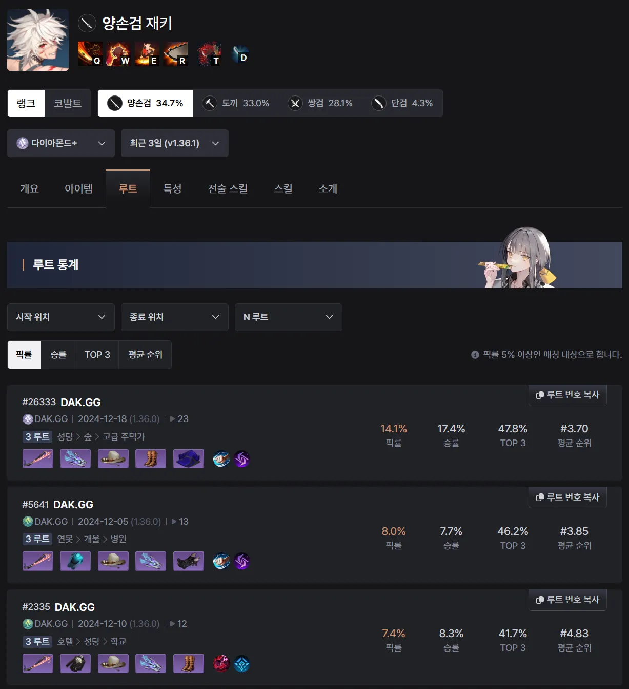 또한, 주로 사용되는 픽률/승률/TOP 3/평균 순위를 통해 루트 운영에 대한 고민을 덜어드립니다.