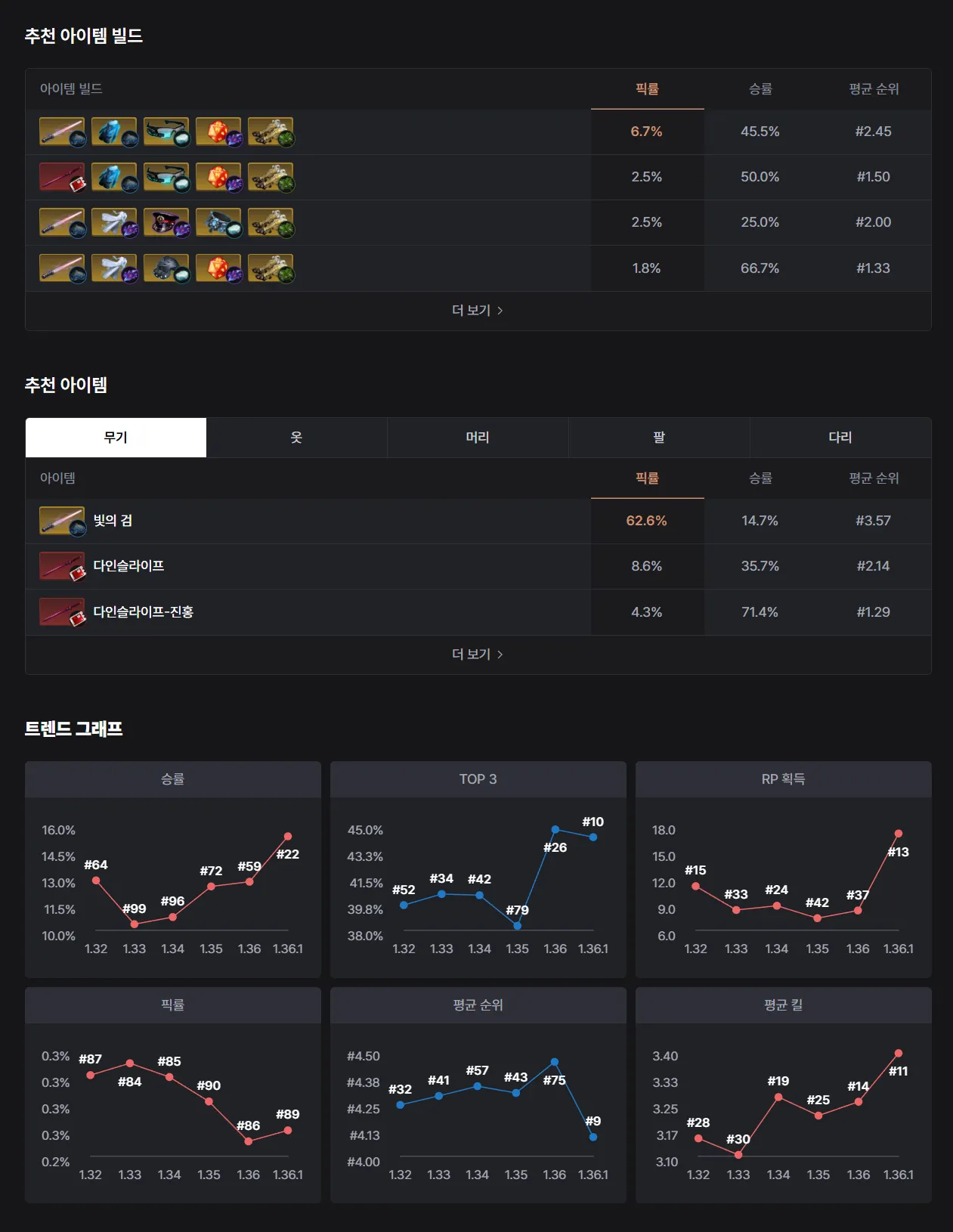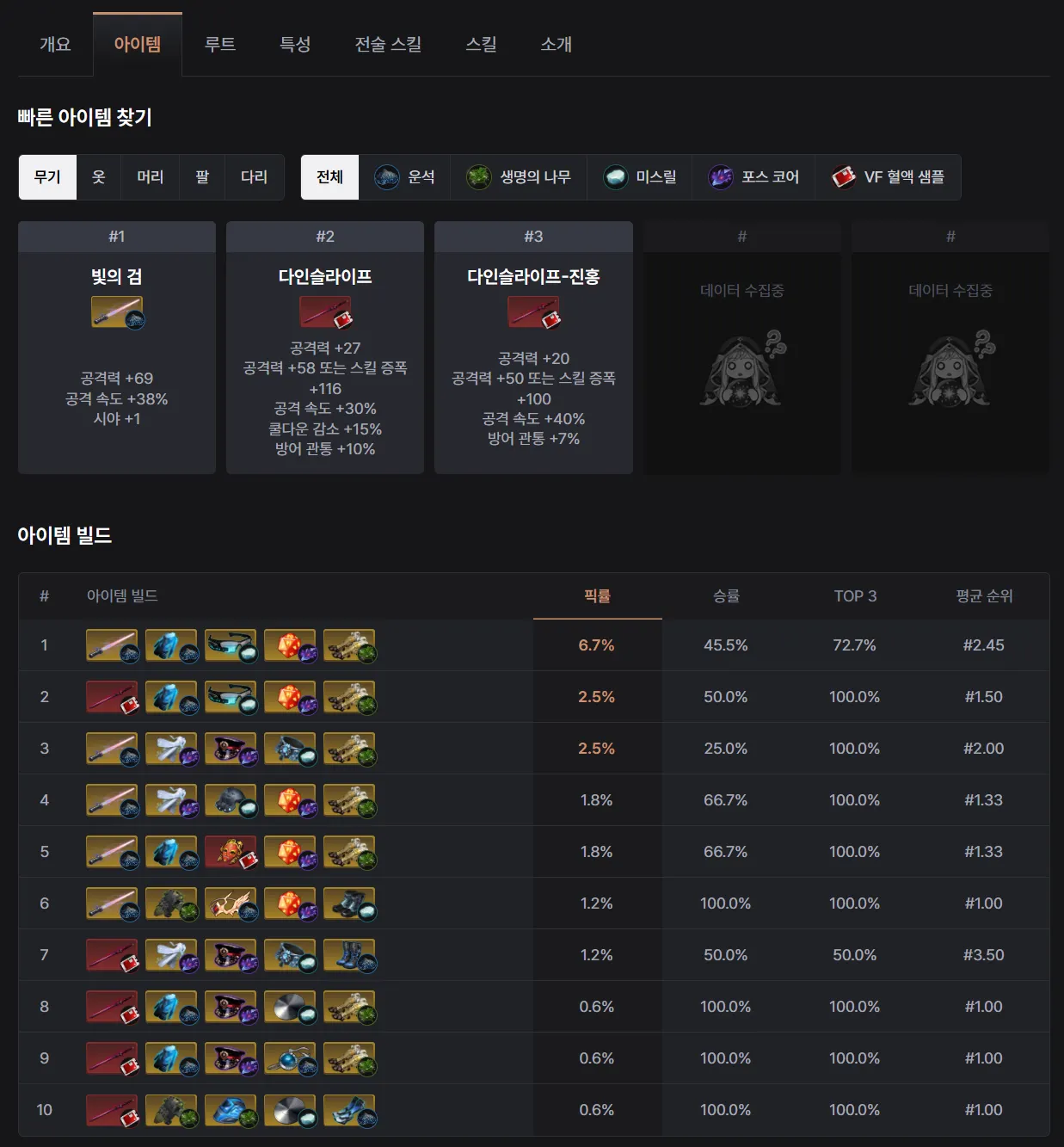 아이템 빌드별 픽률, 승률, TOP 3, 평균 순위를 통해 효율적인 빌드 운영을 할 수 있어요.