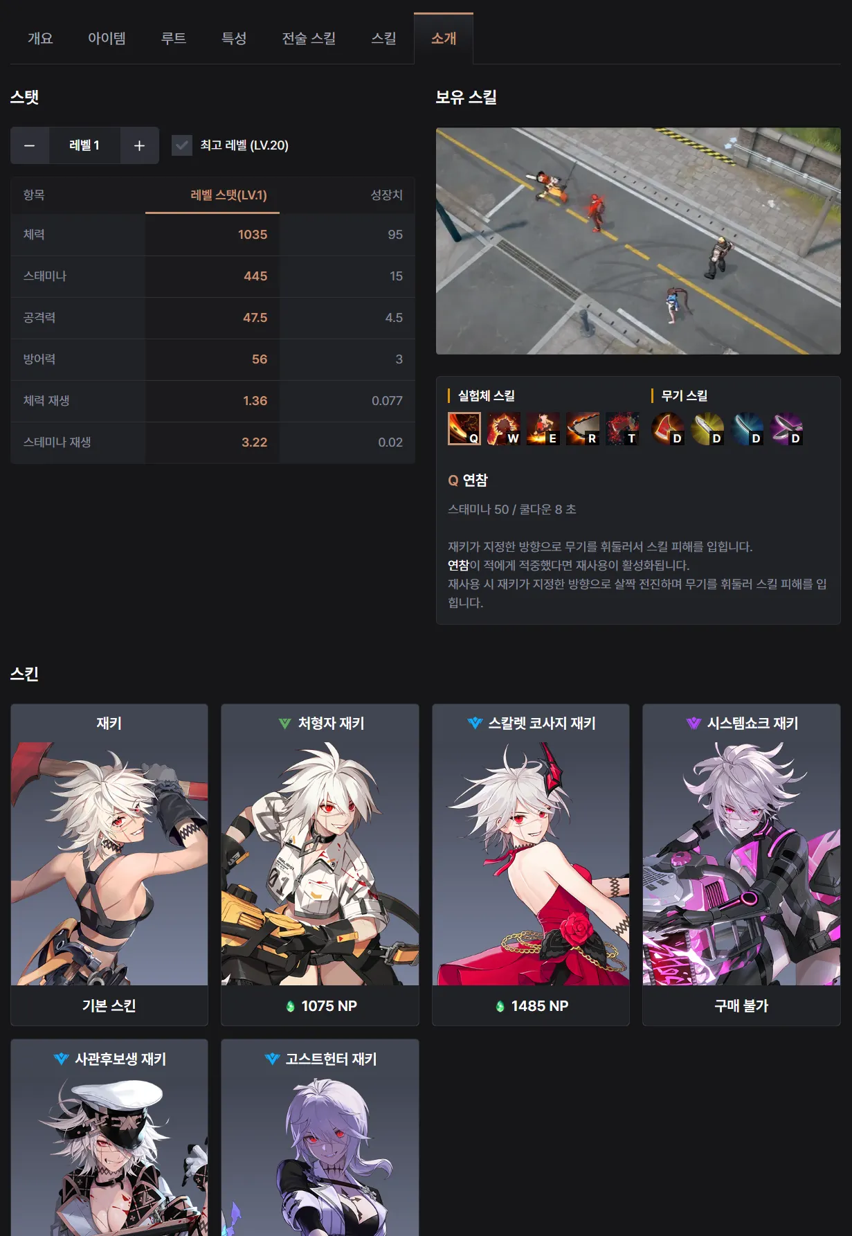 실험체 소개에서는 레벨별 스탯, 성장치와 인게임 플레이 스킬 영상을 확인할 수 있습니다.