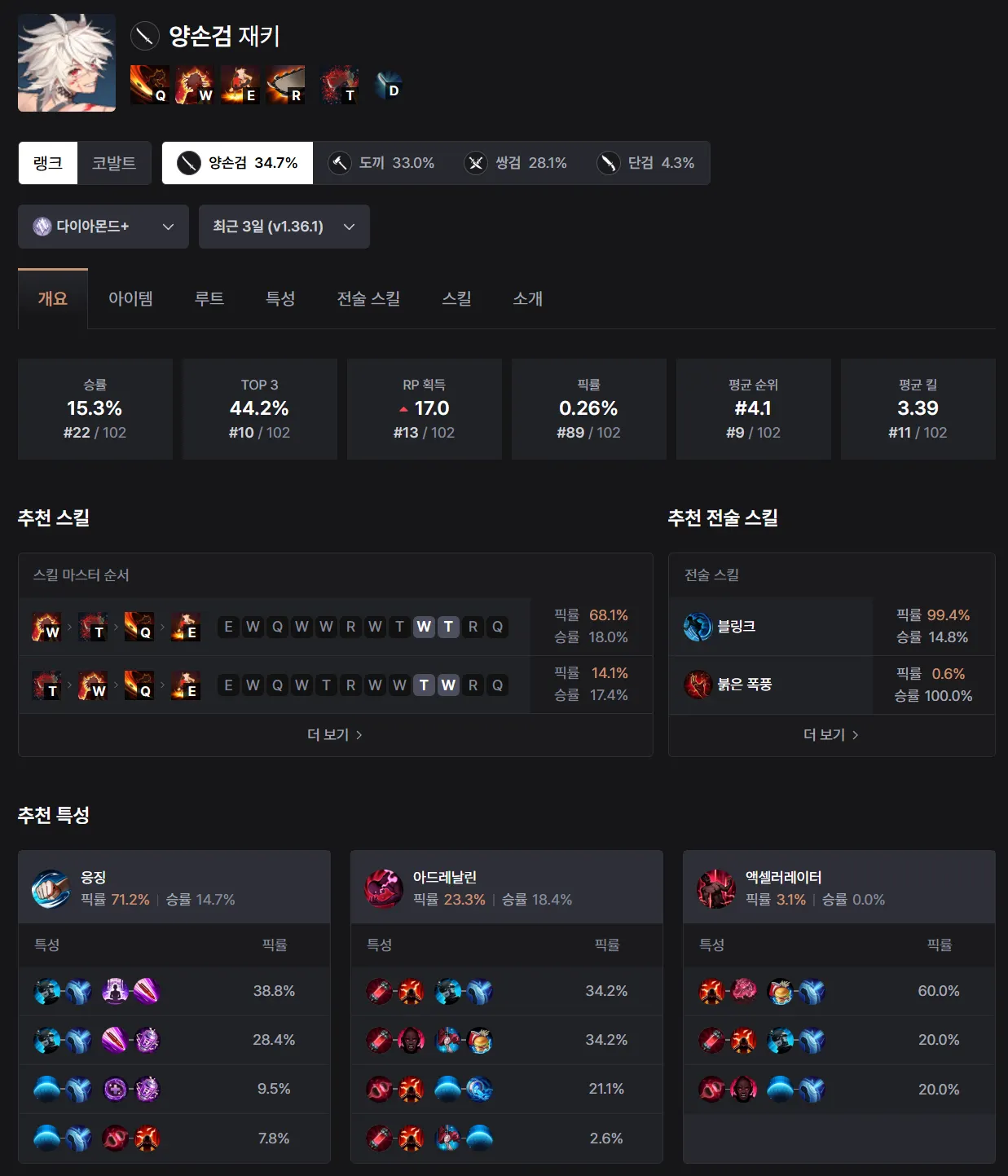 개요에는 실험체의 플레이 통계와 추천 스킬 및 전술 스킬, 그리고 추천 특성이 표시됩니다.