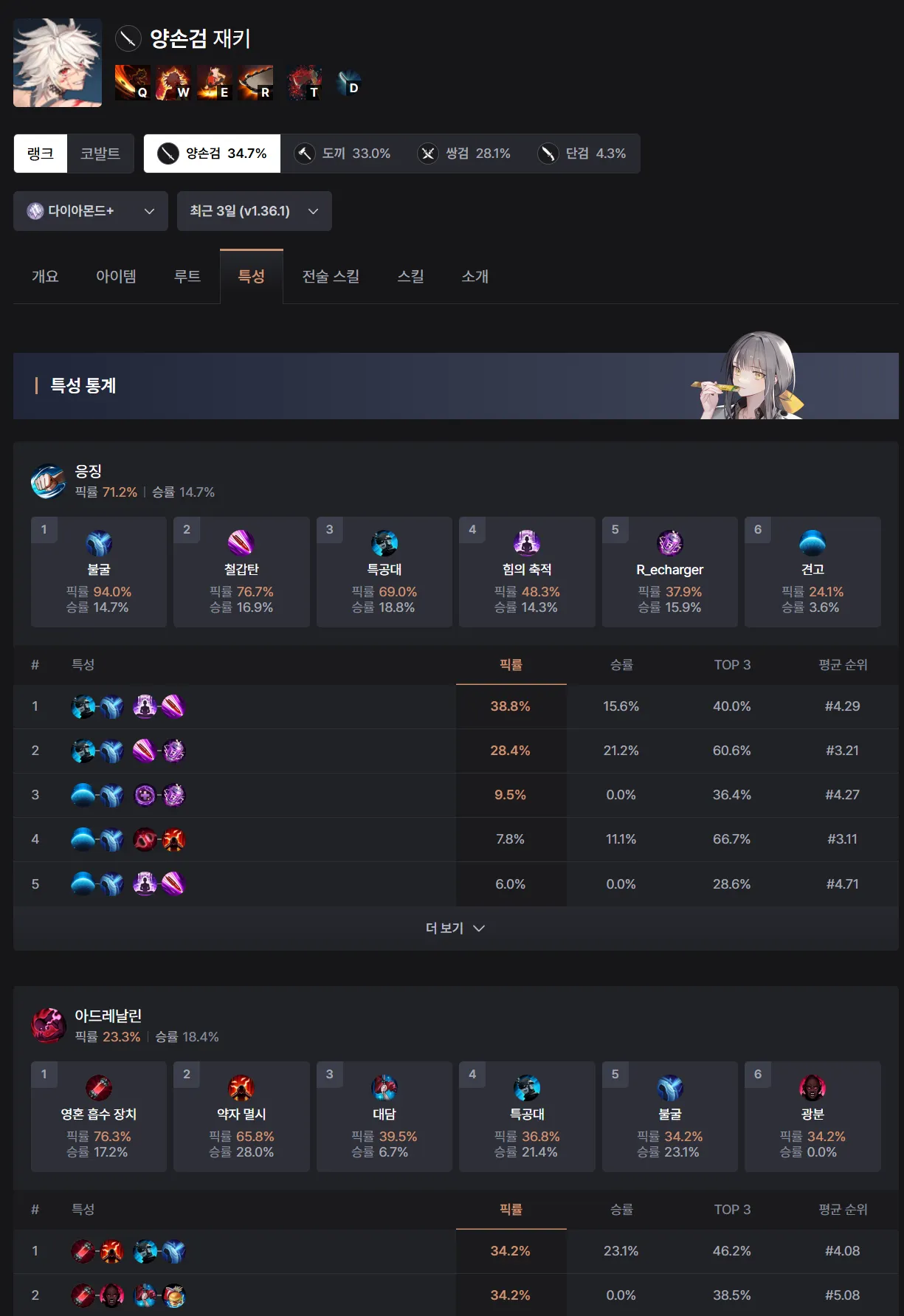 많은 플레이어들의 선택을 받은 주 특성과 부 특성을 세부적인 통계로 제공합니다.
