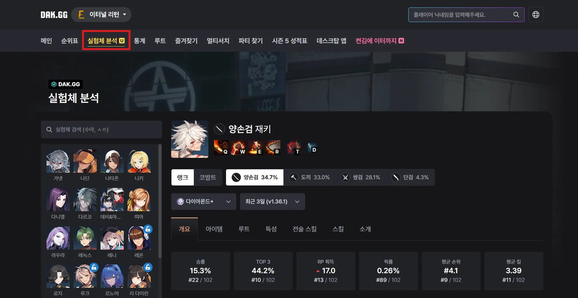 실험체별 세부적인 통계로 효율적인 플레이 운영에 도움을 드리고자 새롭게 개편된 실험체 분석!
