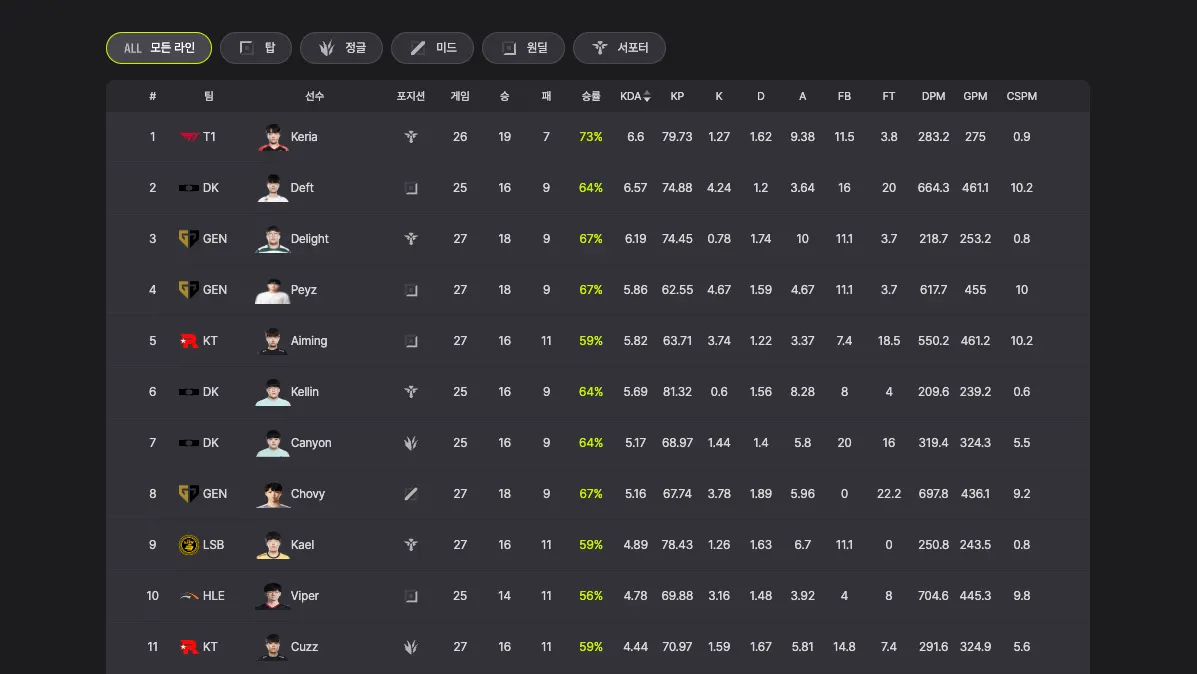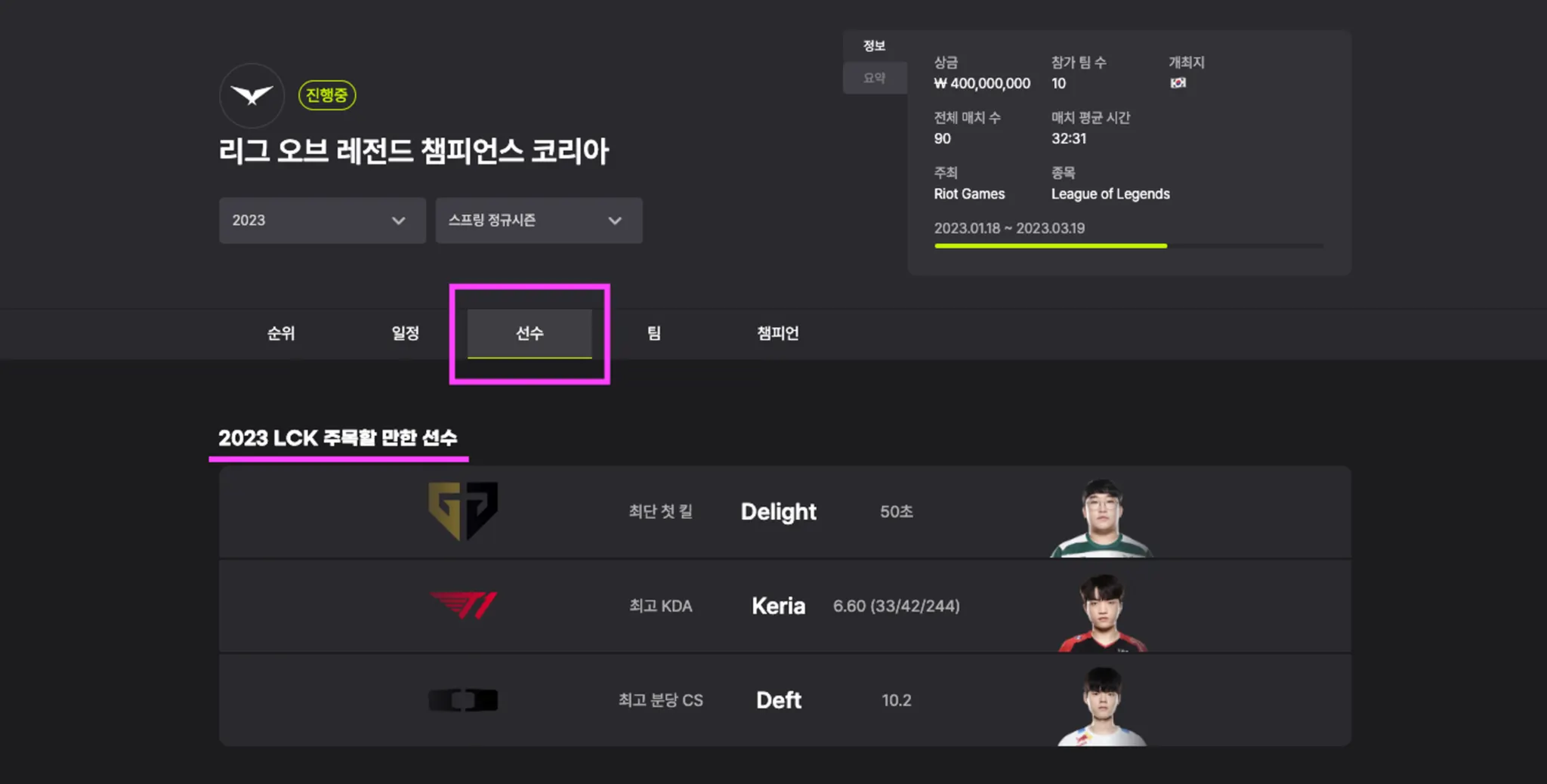 “2023 LCK 주목할 만한 선수는 누구일까요?” 대회 페이지에 마련된 [선수] 탭에서 우수한 성적을 기록하고 있는 선수들을 확인해보세요