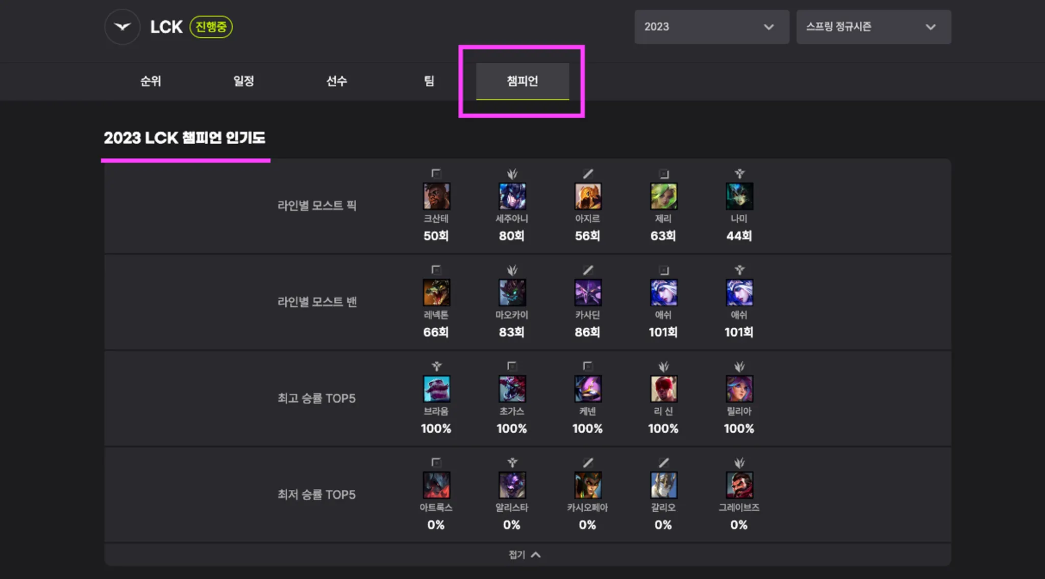 대회 페이지에 마련된 [챔피언] 탭에서 가장 인기있는 챔피언을 만나보세요!