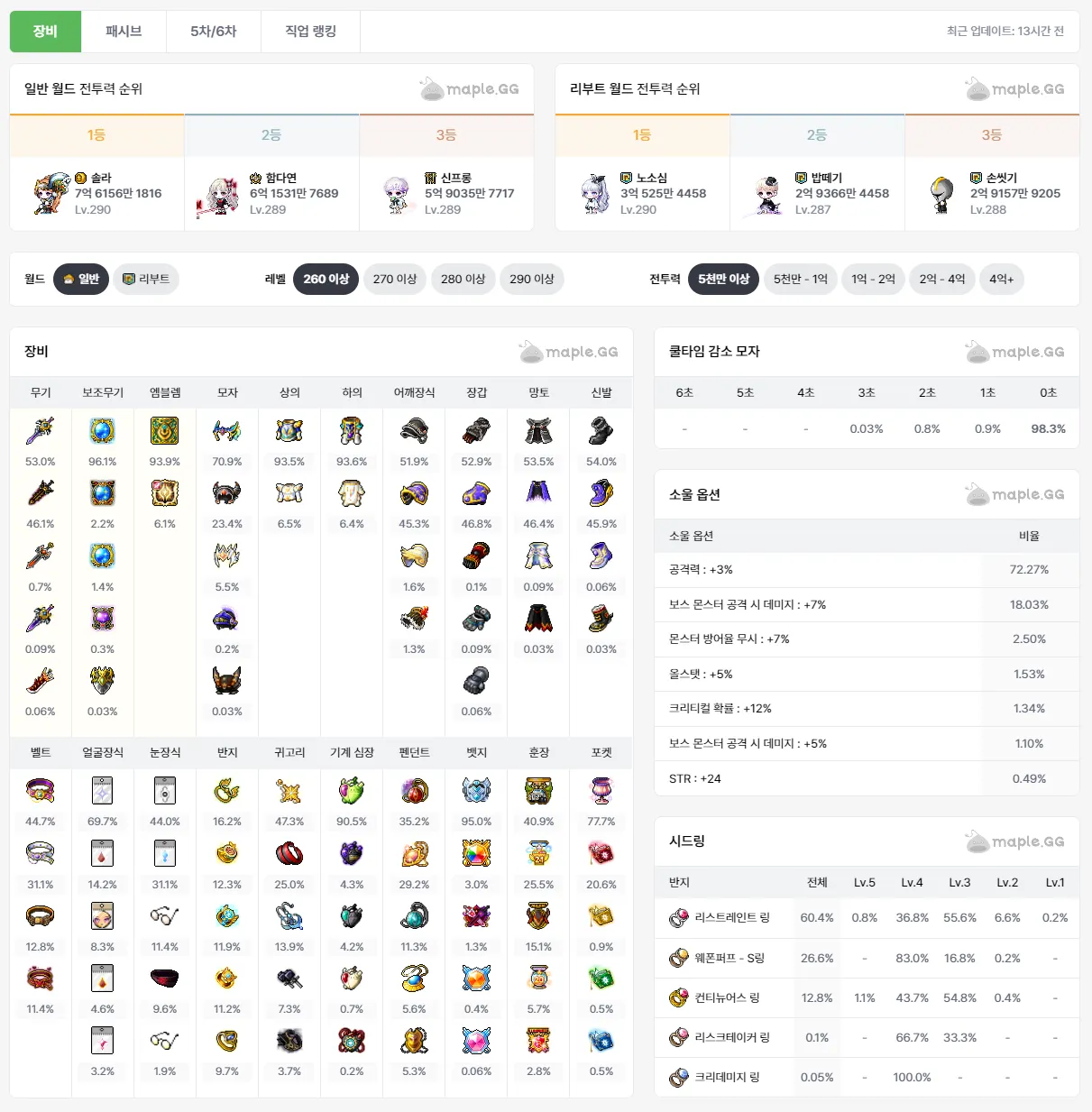 쿨타임 감소 모자(일명: 쿨뚝), 소울 옵션, 시드링의 레벨별 분포 등 다양한 내용을 제공합니다.