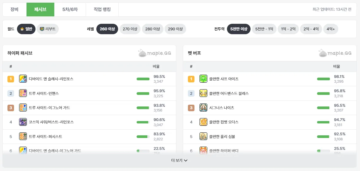 패시브 탭에서는 유저들이 직접 사용하는 패시브 스킬, 펫 버프 등 표본 수와 비율을 제공합니다.