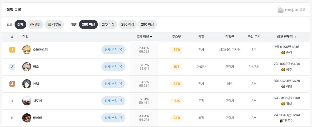 다양한 직업의 상세 분석 정보를 메이플지지에서 확인해보세요!