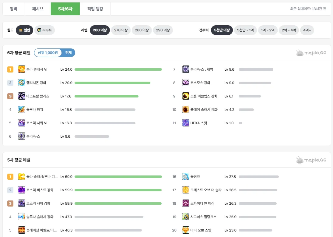 상위 1,000명 또는 전체 플레이어의 평균 레벨을 참고하여 강화 순서에 활용할 수 있습니다.