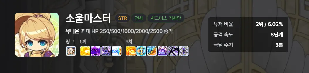 직업의 상세 분석 상단에는 유니온과 링크, 5차/6차 스킬을 비롯한 간략한 정보를 제공합니다.