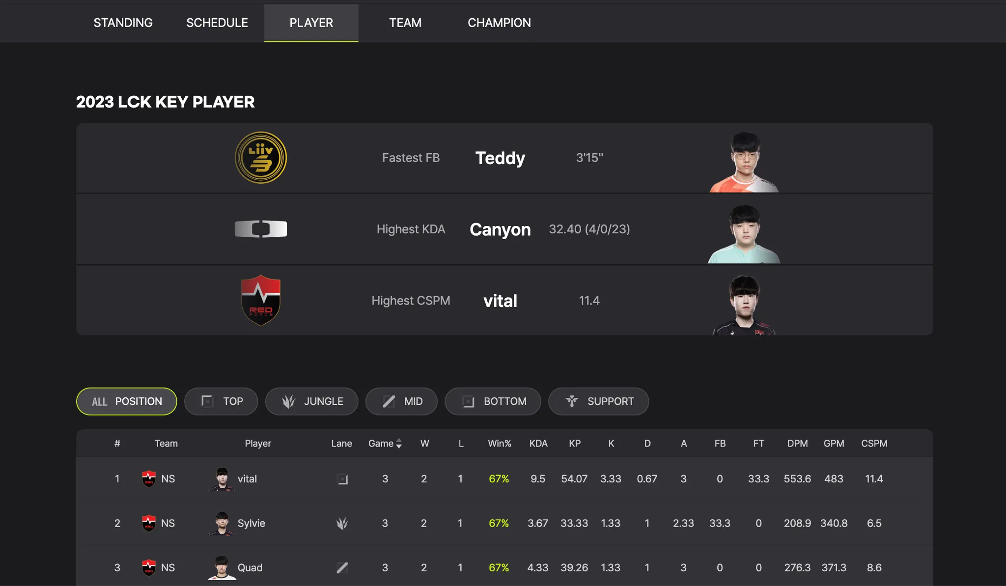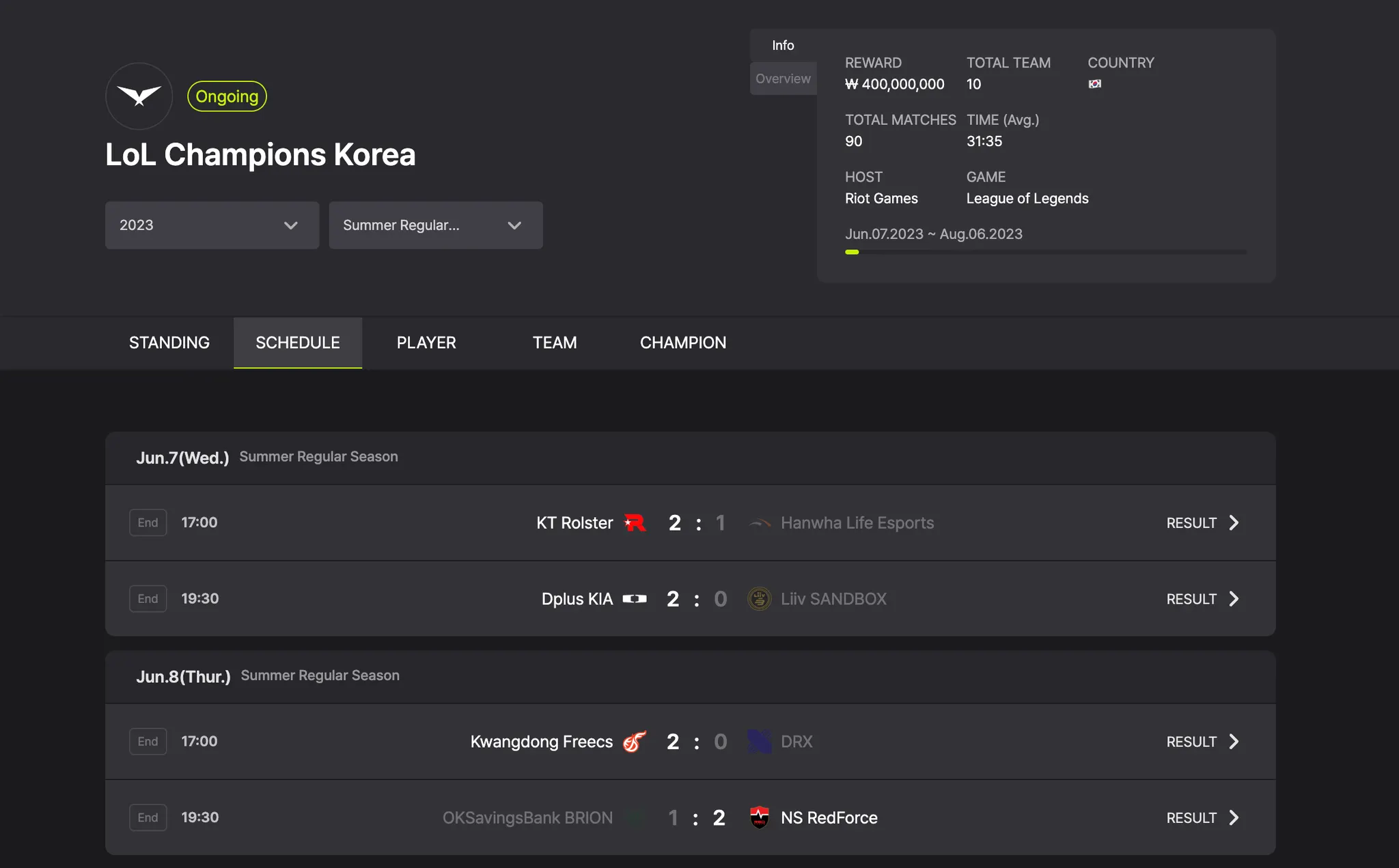 Through Dak.gg eSports, you can check not only ‘schedule’ and ‘results’ but also detailed information on ‘players’, ‘teams’ and ‘champions’!