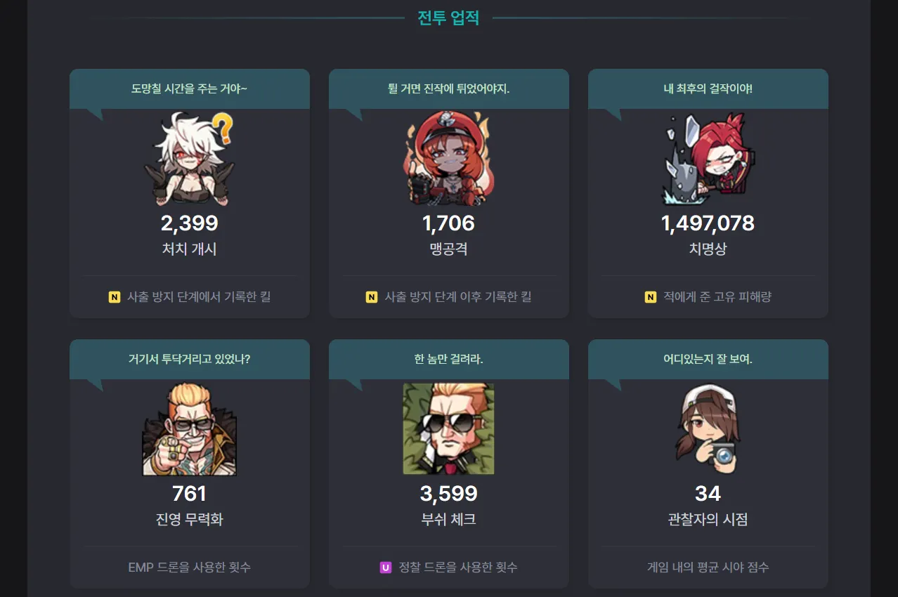 평균 TK와 딜량 등 핵심 전투 스탯은 물론, 선호 특성과 전술 스킬, 부위별 빌드까지 확인 가능해요.