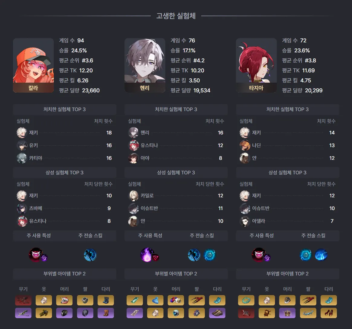 또한, 고생한 실험체 TOP 6의 상세 분석을 제공합니다.