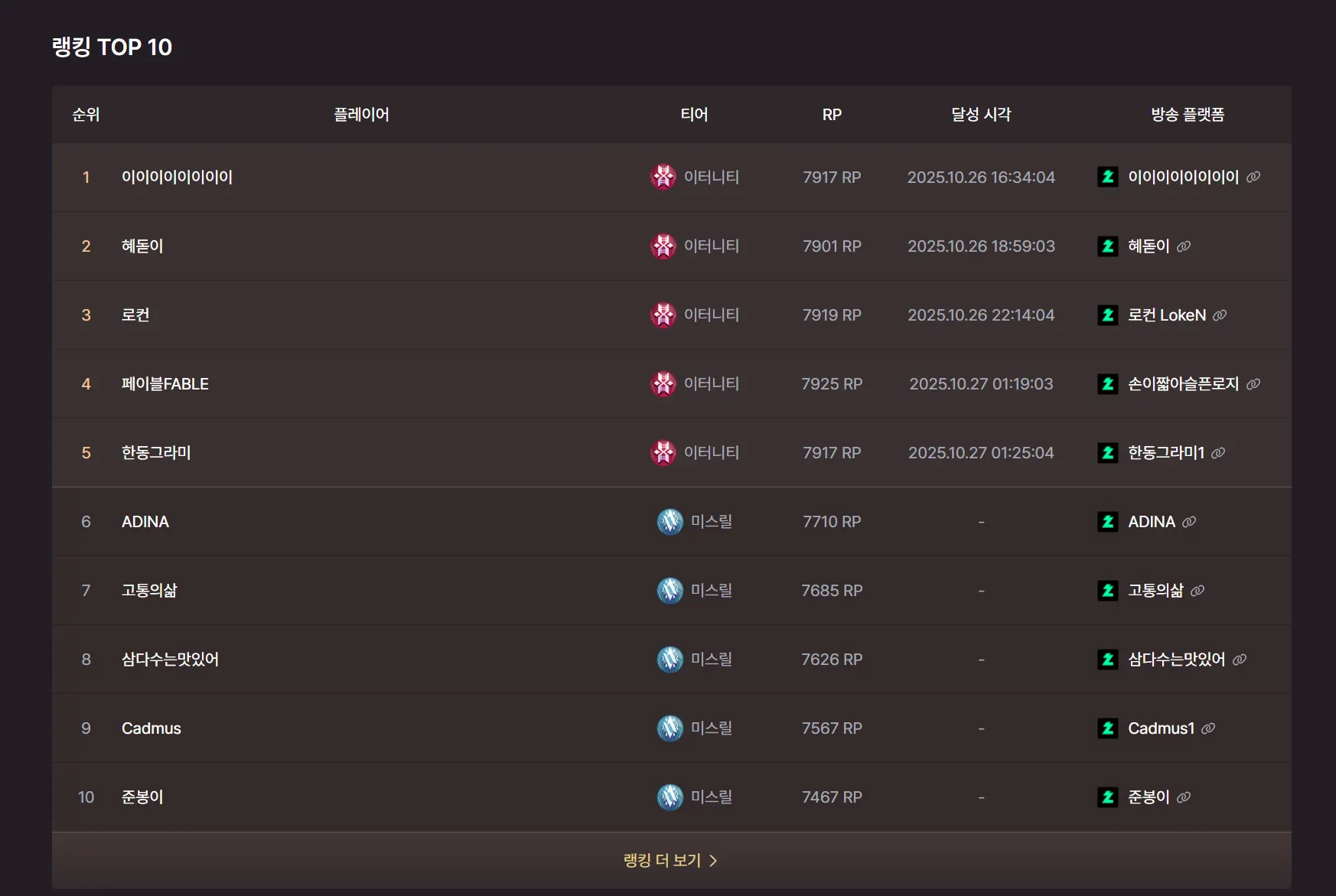 이터니티 티어를 향한 치열한 경쟁 끝에 최종 TOP 5 플레이어가 확정되었습니다.