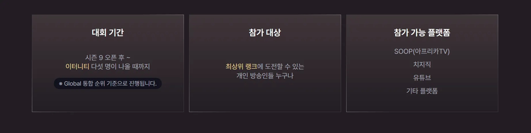 최상위 랭크에 도전할 수 있는 실력을 갖춘 개인 방송인이라면 누구나 참여 가능합니다.