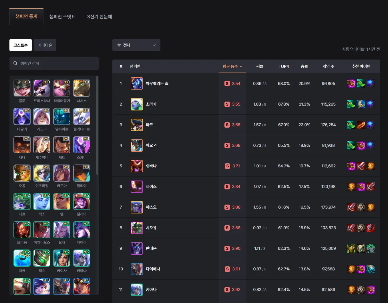 롤체지지 챔피언 통계에서는 각 챔피언의 평균 순위, 픽률, 승률을 한눈에 확인할 수 있습니다.
