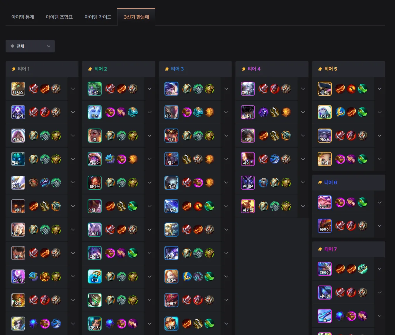 '3신기 한눈에' 메뉴에서는 평균 등수와 승률에 따른 완성 아이템 조합을 간편하게 확인할 수 있습니다.