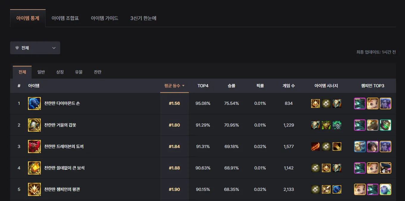 어떤 아이템이 가장 강력한지, 해당 아이템을 착용한 챔피언 TOP 3까지 데이터 기반으로 확인할 수 있어요.