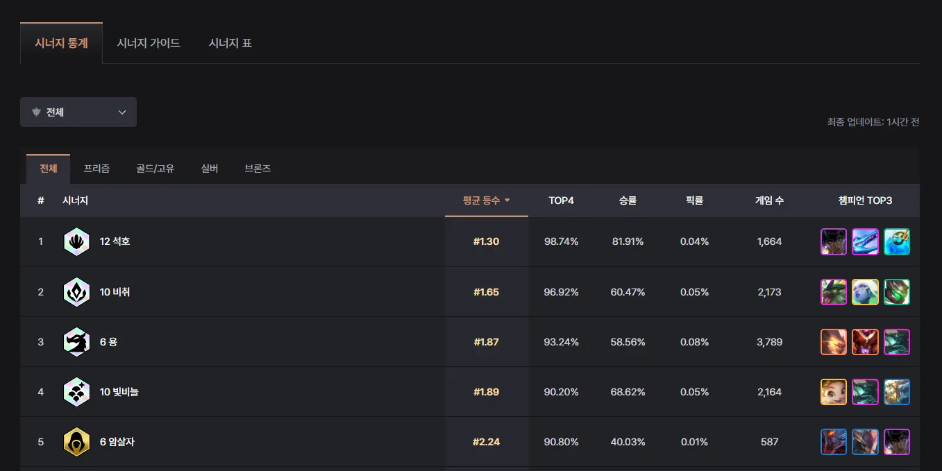 롤체지지 시너지 통계에서는 현재 메타에서의 시너지 조합들을 순위별로 정리하여 제공합니다.